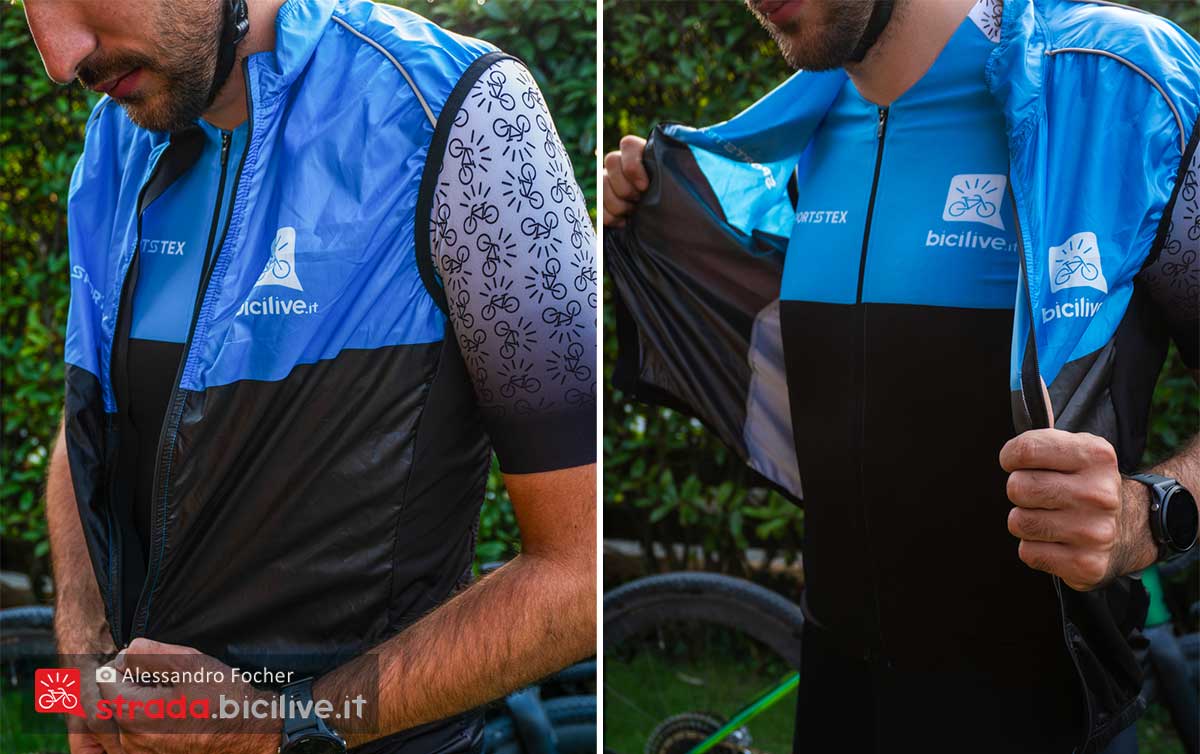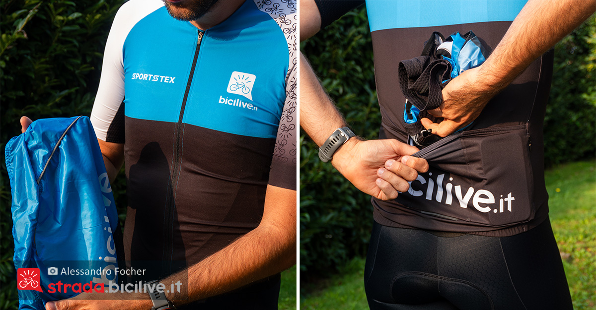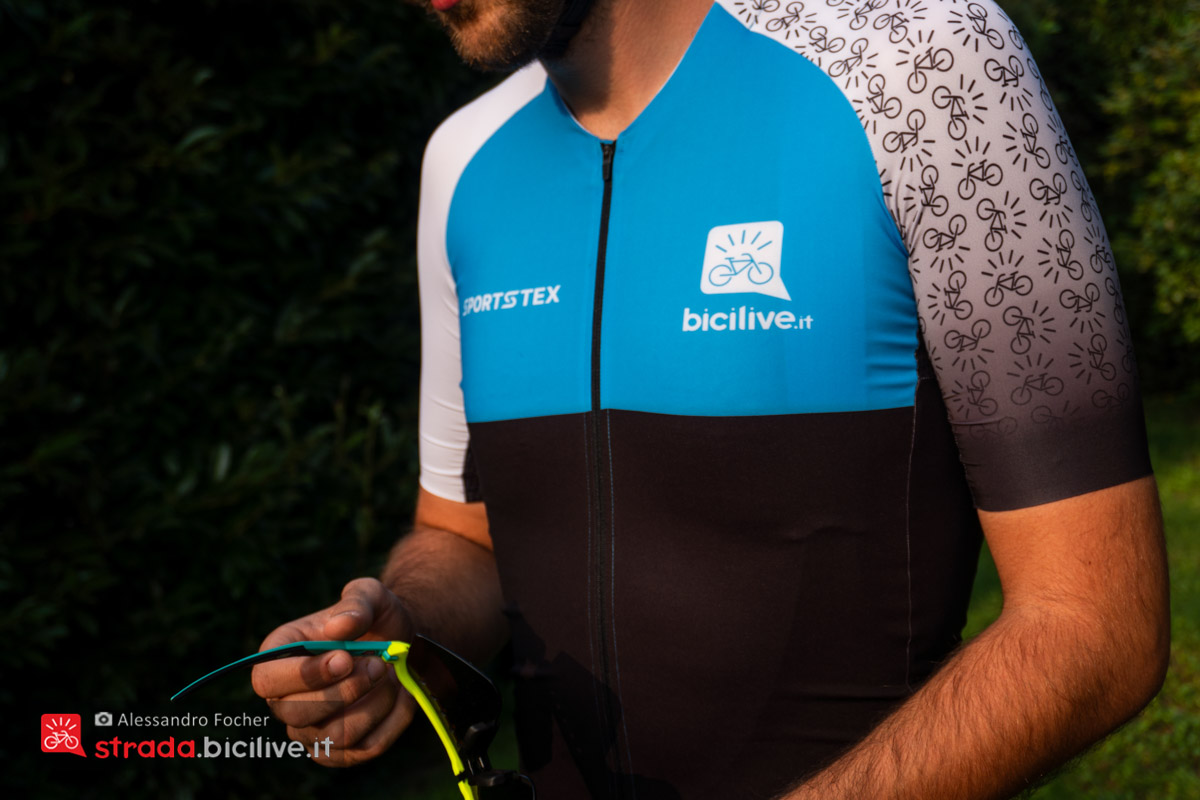 Test completo estivo strada/gravel Sportstex personalizzato Bicilive Alessandro Focher 20 Ottobre 2025 Test Affrontare l’estate in sella significa chiedere al proprio abbigliamento il massimo: traspirazione, leggerezza e resistenza. Il completo estivo strada/gravel Bicilive “made by Sportstex” nasce proprio con questa filosofia, coniugando tecnicità e comfort in un prodotto capace di garantire prestazioni costanti anche nelle giornate più calde. Con Sportstex, la personalizzazione dei capi è praticamente illimitata. Noi abbiamo voluto giocare sul contrasto di bianco, azzurro “Bicilive” e nero alternando i colori su gambe e maniche. Tecnologia e qualità made in Europe Dietro ogni capo Sportstex, azienda italiana che vanta ben sette siti produttivi in Romania, c’è un processo che combina tecnologia d’avanguardia e artigianalità europea. Ne abbiamo parlato ampiamente in questo articolo. L’azienda è specializzata nella produzione di abbigliamento sportivo personalizzato. Per garantire la massima qualità, impiega diverse soluzioni industriali di altissimo livello, dal taglio multistrato con sistemi Lectra e Morgan fino alle macchine laser di ultima generazione, che assicurano una precisione estrema e bordi perfetti senza contatto diretto con il tessuto. L’integrazione dell’intelligenza artificiale consente di ottimizzare automaticamente parametri come la velocità di taglio o l’affilatura delle lame, riducendo sprechi e migliorando la qualità del prodotto finito. Sportstex utilizza inoltre tecniche avanzate di fustellatura, ideali per lavorazioni di estrema precisione e per materiali complessi come quelli impiegati nei fondelli dei pantaloncini da ciclismo, e stampa sublimatica per ottenere grafiche nitide, traspiranti e durature, senza compromettere l’elasticità dei tessuti. Completano il quadro le tecnologie di finitura con silicone e materiali riflettenti, che uniscono sicurezza e comfort, e il seam sealing, soluzione che rende le cuciture impermeabili, antivento e più resistenti nel tempo. Il risultato è un livello produttivo che si percepisce in ogni dettaglio: vestibilità precisa, cuciture curate, materiali leggeri ma resistenti e un’estetica pulita e contemporanea. Maglia: traspirazione e vestibilità La maglia è della linea JUPITER MEN del catalogo dell’azienda di Bolzano ed è stata personalizzata con una nostra idea grafica, realizzata poi “dal vivo” assieme al grafico di Sportstex. Si tratta di una maglia a manica corta “raglan” dotata di cerniera camlock inversa, inserto in rete sotto la manica, maniche a taglio vivo, tre tasche posteriori con piping riflettente e una tasca laterale portachiavi con cerniera invisibile. La parte anteriore in vita è realizzata tramite incollatura (bonding). Durante i test estivi, la maglia ha dimostrato delle ottime capacità di traspirazione. Il tessuto microforato favorisce la ventilazione e l’evaporazione rapida del sudore, mantenendo la pelle asciutta anche nelle giornate più torride. Il taglio anatomico segue perfettamente la posizione in bici, con una vestibilità aderente ma confortevole, adatta sia agli allenamenti lunghi che alle uscite più brevi e intense. Le maniche a taglio vivo aderiscono senza costringere e il bordo in silicone in vita mantiene la maglia stabile anche in posizione aerodinamica. Le tasche posteriori sono capienti, in più quella con la zip dà la sicurezza di avere le chiavi o dei documenti al sicuro anche nelle uscite più dissestate in gravel. Bib corto: comfort duraturo Il bib, ovvero il pantaloncino Sportstex è il vero protagonista del completo. Qui abbiamo scelto un pantaloncino della serie BIB SHORT 40th : si tratta di in bib con bretelle realizzato in tessuto speciale Thunderbike con goffratura, eccellente per la presa sulla sella e la microcompressione muscolare. Le bretelle e la rete sul retro hanno un effetto 3D per una migliore traspirazione. Pratica tasca sul retro, utile per riporre gel, smartphone o piccoli oggetti. Polsini morbidi, elasticizzati e stampabili. Il fondello che abbiamo scelto è il CARBON MEN. Il BIB SHORT 40TH di Sportstex con una delle grafiche che propone l’azienda. Il fondello è prodotto in casa dall’azienda (ne propone ben 17 modelli nel suo catalogo) e anche dopo diverse ore di utilizzo ha dimostrato una sorprendente solidità. Il CARBON MEN presenta degli inserti in schiuma ad alta densità posizionati nei punti di pressione chiave per garantire comfort nella tipica posizione da strada. Le ali laterali morbide contribuiscono a un posizionamento ottimale. Inoltre, lo strato base Soft-Touch Carbon, trattato con un agente antibatterico e con filamenti di carbonio, assicura igiene dissipando l’elettricità statica, prevenendo la proliferazione batterica e riducendo i cattivi odori per un comfort cutaneo superiore. I dettagli del fondello CARBON MEN di Sportstex. Nel nostro test, durante i mesi non ha perso densità né sostegno, garantendo comfort costante anche dopo molte uscite e lavaggi. La sensazione di stabilità in sella resta invariata e il supporto nelle zone di pressione è sempre equilibrato. È un capo pensato per durare e per offrire una seduta confortevole anche sulle lunghe distanze. Gilet antivento: leggero e compatto Il gilet antivento Lipari Pro Mesh completa il set offrendo una protezione efficace nelle discese o nelle ore più fresche. Si tratta di uno smanicato in tessuto leggerissimo e antivento, dotato di inserti laterali in tessuto elasticizzato. La chiusura è con cerniera lampo inversa. Sono presenti dei dettagli riflettenti sulle spalle, davanti e dietro mentre il retro, da sotto alle scapole in giù, è realizzato in tessuto a rete. Il tessuto frontale scherma bene dal vento, mentre la struttura resta leggera e facilmente comprimibile: si piega in pochi secondi e trova posto nella tasca posteriore della maglia. Personalmente avrei preferito un tessuto a rete anche nella parte alta della schiena per m
