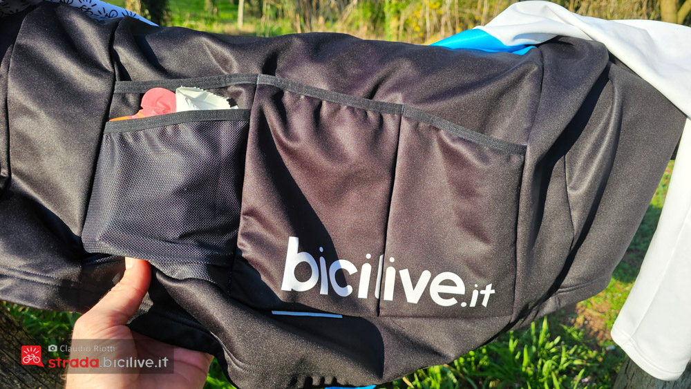 Le cerniere sono a chiusura Camlock e sul retro troviamo tre tasche molto capienti, con una aggiuntiva in rete per le barrette o i gel.