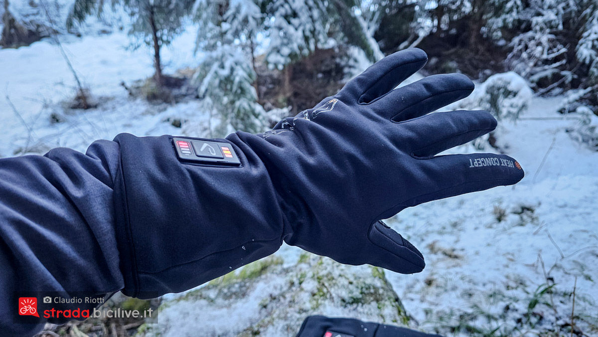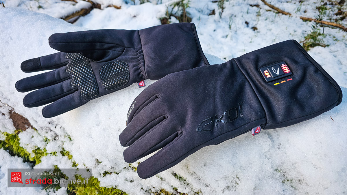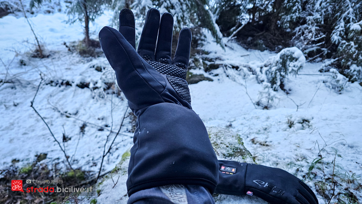 Test guanti riscaldanti EKOI Perf HEAT CONCEPT Primaloft Claudio Riotti 26 Gennaio 2026 Test Molti durante l’inverno “appendono la bici al chiodo” oppure sfruttano la neve (quando c’è) per fare altri sport come sci, snowboard e ciaspolate. Noi della redazione non ci fermiamo mai perché non esiste cattivo tempo ma esiste solo cattivo equipaggiamento, celebre aforisma attribuito a Robert Baden-Powell, il fondatore del movimento scout. Ci piace comunque fare sport invernali e quindi a maggior ragione abbiamo chiesto in test all’azienda francese EKOI questi guanti riscaldanti. Vediamoli nel dettaglio. Guanti riscaldanti EKOI Perf HEAT CONCEPT Primaloft EKOI produce abbigliamento e accessori per ciclismo di tutti i tipi. Del catalogo abbiamo scelto i Perf HEAT CONCEPT Primaloft perché ci sembrano quelli meno “ingombranti” rispetto ai vari modelli sia che offre l’azienda sia tra quelli dei competitor. Il prezzo, davvero alto, era di 274 euro ma ora si trovano scontati sul sito ufficiale alla cifra molto più abbordabile di 109,80 euro. Caratteristiche tecniche Questo modello riscaldato è indicato per “ciclismo e outdoor” ed è dichiarato per pedalare da +5° a -12°C. I guanti diffondono, a detta dell’azienda, un calore omogeneo grazie al sistema Heat Concept e ai suoi tre livelli regolabili tramite un pulsante luminoso sul dorso del guanto. Sono anche dichiarati traspiranti, resistenti all’umidità, caldi e flessibili. Presentano inoltre dei palmi antiscivolo e l’indice e il pollice sono touch-screen compatibili. Vedremo nel test sul campo se tutte queste promesse sono mantenute. Contenuto del kit 1 paio di guanti riscaldanti 2 batterie ricaricabili incluse 1 caricatore a doppia uscita incluso con presa USB-C Manuale d’uso In pillole Dorso: materiale idrorepellente efficace contro il freddo umido, composizione: 94% Poliammide – 6% Elastan Palmo: 50% Poliestere – 50% Nylon Fodera: 100% Poliestere Interno: tessuto PRIMALOFT® ACTIVE: morbidezza e comfort a contatto con la pelle + traspirabilità e asciugatura rapida Vestibilità aderente simile a quella di un guanto tradizionale: feeling di guida ottimale Polsini alti e dritti: passaggio delle maniche facilitato Indice e pollice touchscreen Palmo con grip antiscivolo Batterie ricaricabili estraibili ai polimeri di litio 7.4V: LI-PO 2600 mAh Potenza di uscita massima: 11.5 W Tempo di ricarica: circa 5 ore Garanzia di 2 anni su guanti e batterie Peso guanto con batteria: 205 grammi singolo, 410 grammi il paio Peso guanto senza batteria: 105 grammi singolo, 210 grammi il paio Prezzo: 109,80 euro scontati Optional batterie aggiuntive: 60 euro la coppia Dettagli del pulsante di regolazione della temperatura (su cui troviamo anche 4 piccole barre che indicano la carica della batteria): – 1 pressione : LED ROSSO 40°C (autonomia fino a 1,5 ore). – 2 pressioni successive : LED ARANCIONE 35°C (autonomia fino a 2,5 ore). – 3 pressioni successive : LED VERDE 30°C (autonomia fino a 4 ore). – Indicatore del livello di carica della batteria: 4 barre rosse = 100% 3 barre rosse = 75% 2 barre rosse = 50% 1 barra rossa = 25% Il test sul campo Ho utilizzato questi guanti durante i mesi più freddi dell’anno con la bici gravel che in uso al momento, la GHOST ASKET CF X che abbiamo testato. Li ho poi usati per diverse escursioni a piedi e ciaspolate e anche qualche uscita in sella alla e-MTB GHOST E-RIOT CF LTD che abbiamo testato. Infine li ho usati in città sulla bici “da battaglia” della mia compagna, quella che se anche non la leghi fuori dal bar non te la ruba nessuno. Come dimensioni sono abbastanza importanti, sembrano più un guanto da sci che uno invernale da bici. La batteria è alloggiata in una piccola tasca con zip sotto al polso e si connette con un cavetto con mini-jack. Per caricarla va tolta dal guanto e si utilizza il caricabatterie in dotazione che ha un doppio spinotto USB-C. Indossare e togliere i guanti è abbastanza semplice, meno se si hanno le mani un po’ sudate, cosa che vado ad approfondire nel paragrafo più in basso. L’importante è fare attenzione a non tirare troppo forte il guanto dall’alloggiamento della batteria perché la cerniera o il cavetto potrebbero danneggiarsi. Il touch screen di pollice e indice funziona bene, è possibile usare lo smartphone o lo schermo del ciclocomputer con i guanti indossati, anche se la destrezza delle dita è abbastanza ridotta date le dimensioni e lo spessore dei guanti. La scelta della taglia Per quanto riguarda la taglia generalmente porto una L ma in base alle misure che consiglia il sito EKOI ho scelto una XL. Fate attenzione con il sistema di calcolo della misura, pur essendo abbastanza preciso (richiede la larghezza palmo e la lunghezza dito medio) alla fine la taglia che mi ha consigliato, la XL, ha le dita molto lunghe, specialmente pollice e indice, ma sono studiate così per quando si impugna il manubrio. Per esperienza nel mio caso conviene sempre prendere una taglia leggermente più grande. Questo per evitare di avere la spiacevole sensazione di costrizione alle punte delle dita quando il guanto è perfettamente aderente, cosa che alla lunga non fa che aumentare la perdita di sensibilità. In generale comunque posso dire che le taglie di EKOI siano abbastanza aderenti quindi va bene salire di una taglia rispetto alla vostra, poi ci sono sempre le eccezioni del caso. Una doverosa premessa Soffro, fin da ragazzo, della sindrome di Raynaud, che causa restringimento dei vasi sanguigni a mani e piedi in risposta a freddo o stress con perdita di sensibilità e intorpidimento. Mi basta toccare la leva del freno fredda che subito perdo sensibilità all’indice. Spesso poi “mi partono” il medio e anche le altre dita fino a non riuscire più a guidare la bici, specialmente se si tratta di MTB. Mi devo quindi fermare e metterle in un posto caldo, in tasca, per 5 minuti o se fa davvero molto freddo (-5° o -10°) devo bagnarle con l’a